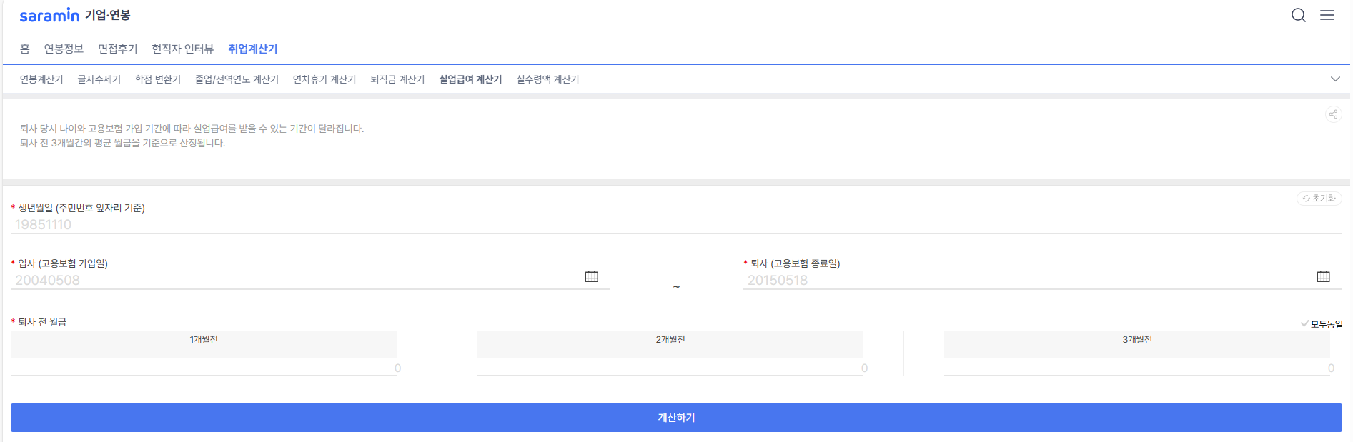 고용노동부 또는 워크넷, 사람인 등 월급, 가입 기간을 입력하면 예측 수급액 확인이 가능합니다.